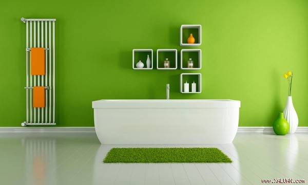 Xanh táo tạo cảm giác tươi mới, kết hợp cùng cửa sổ cỡ lớn, bức tường màu ghi, bồn tắm và sàn nhà màu trắng – đơn giản nhưng hiệu quả.