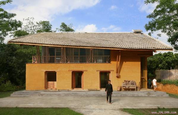 Nhà có 2 tầng, với tường đất dày 80 cm, có màu sắc, vật liệu thân thiện. Kết cấu nhà là khung bê tông kết hợp vi kèo gỗ.